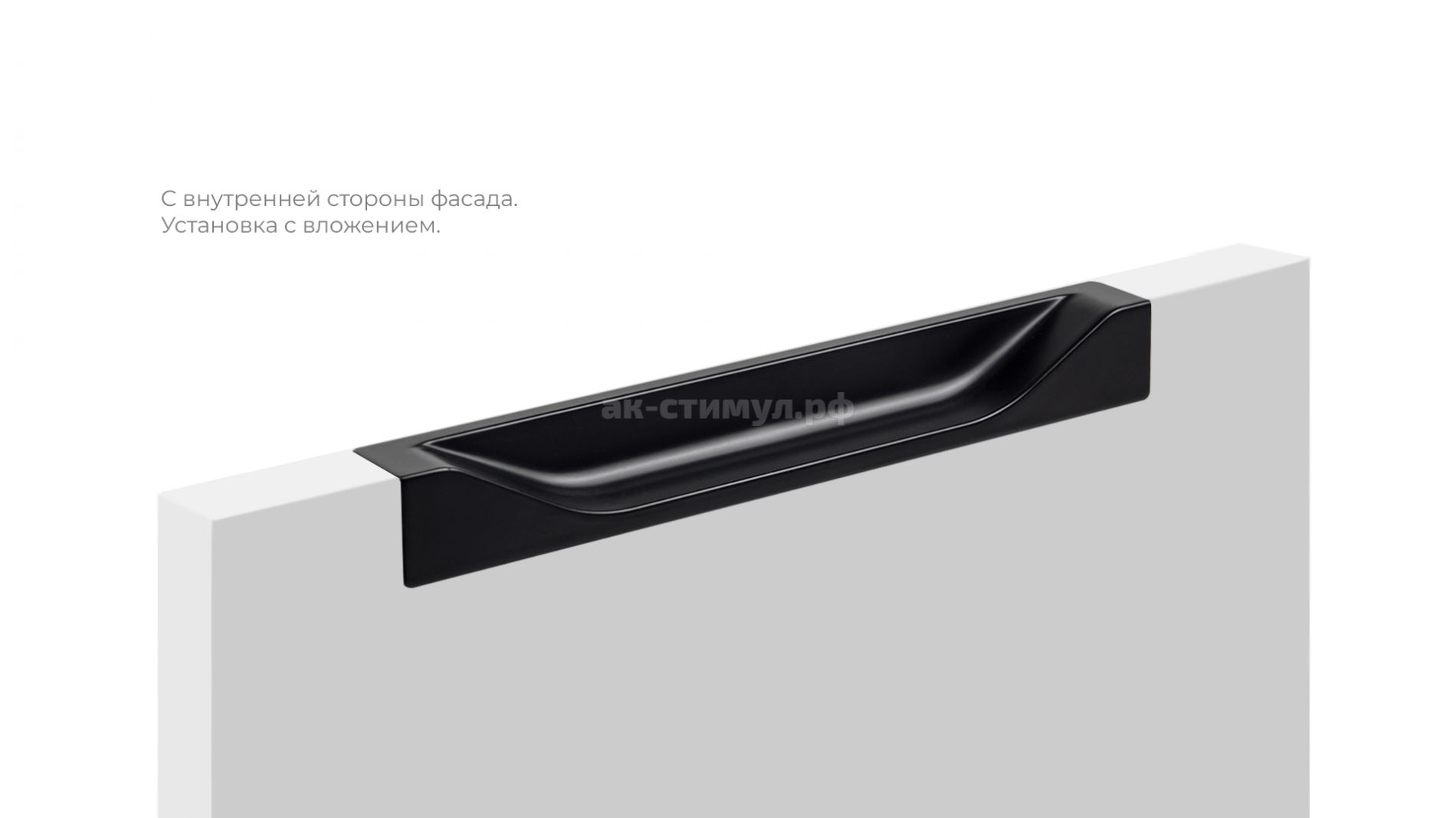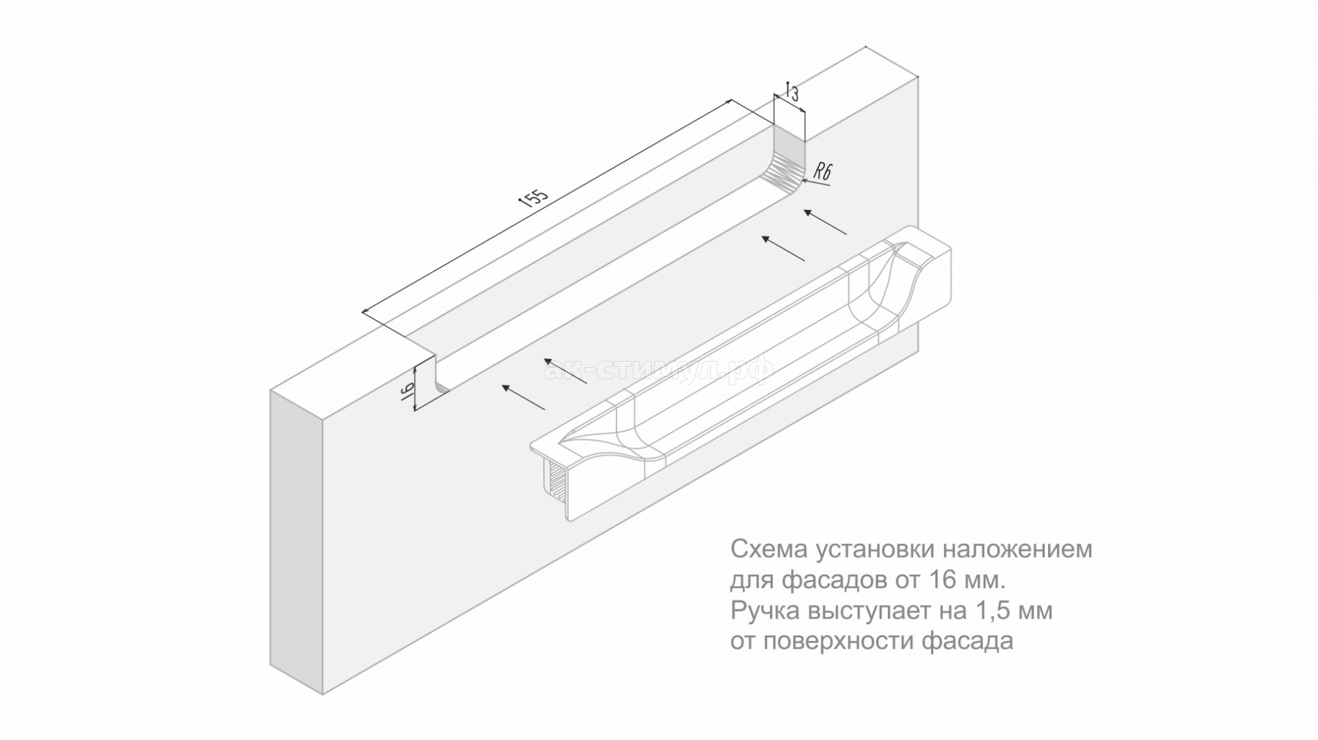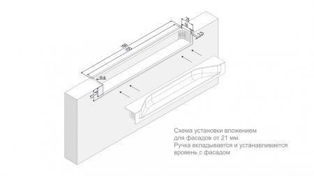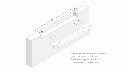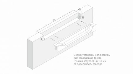 Монтаж ADAM RT021 возможен в нескольких вариантах: наложением на фасад с выступом на 1,5 мм от поверхности фасада, либо вложением в фасад чётко вровень с его уровнем. Для надёжной фиксации ручки с фасадом применяется клей (приобретается отдельно в специализированных магазинах в зависимости от материала фасада).