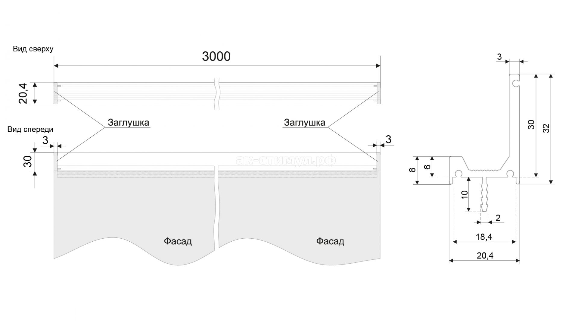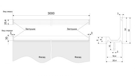 Для того чтобы профильная ручка совместно с заглушками не выходила за плоскость фасада справа и слева необходимо при расчёте длины ручки учесть место под заглушки — 3 мм с каждой стороны. В противном случае заглушки будут выступать с обеих сторон от кромки фасада на 3 мм.