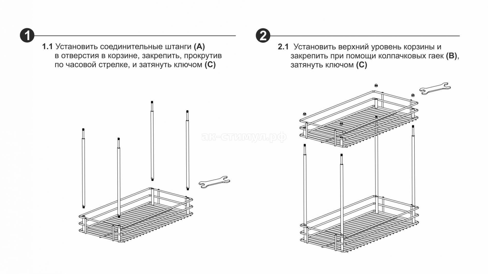 В нижнюю корзину вкрутить по резьбе боковые стойки, затянуть, а затем сверху надеть вторую корзину. Какая из корзин будет верхней/нижней не важно, они универсальные. После этого верхняя корзина крепится гайками и затягивается ключом. Всё необходимое для этого есть в комплекте.