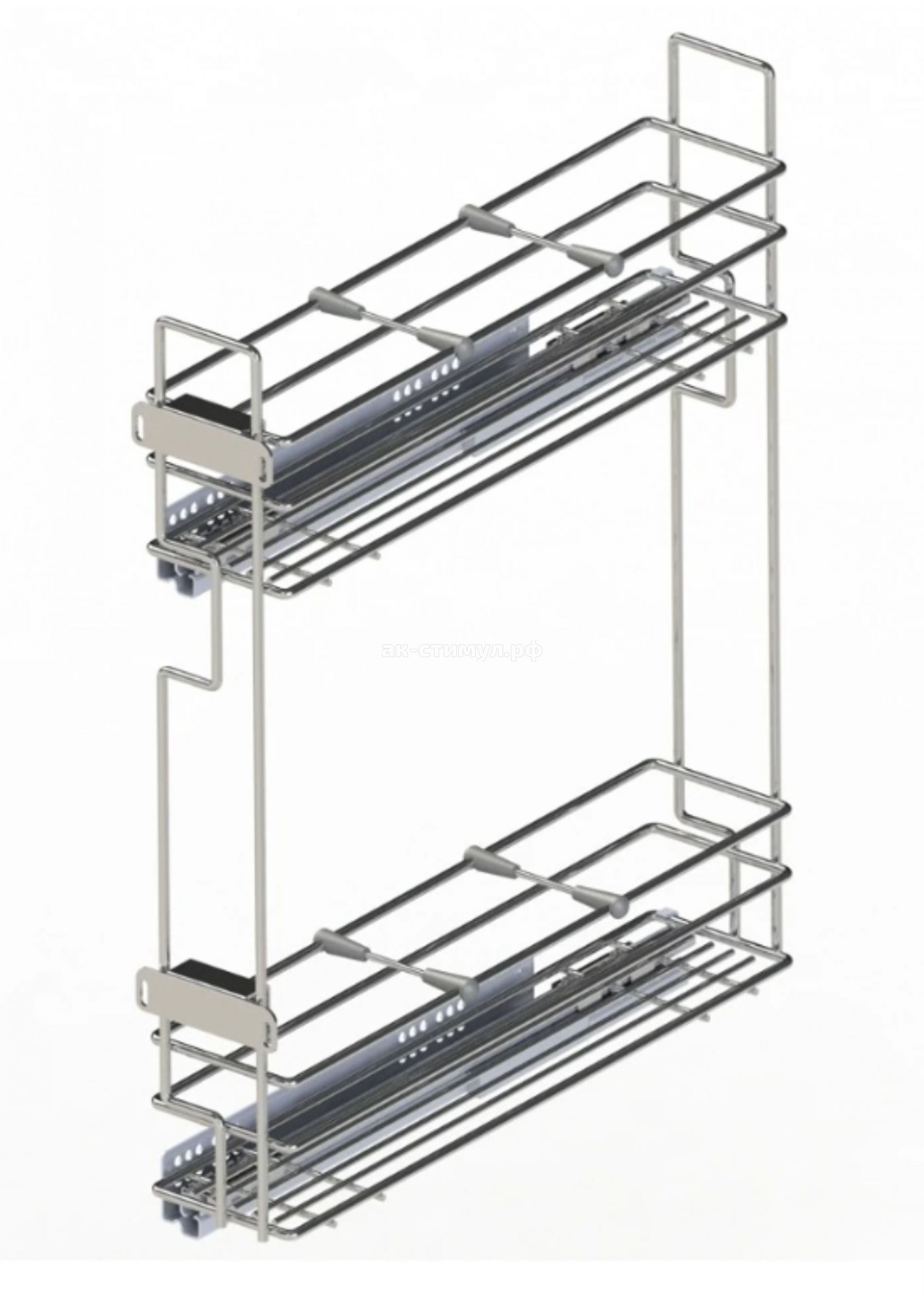 Бутылочница в модуль 150 мм, левая, 4 перегородки, направляющие GTV с доводчиком, хром - специализированный элемент кухонной мебели в виде двухуровневой выдвижной корзины, предназначенный для рационального хранения бутылок и ёмкостей с жидкостями (растительное масло, соусы, напитки и т. п.), а также банок со специями, крупами и другими продуктами.