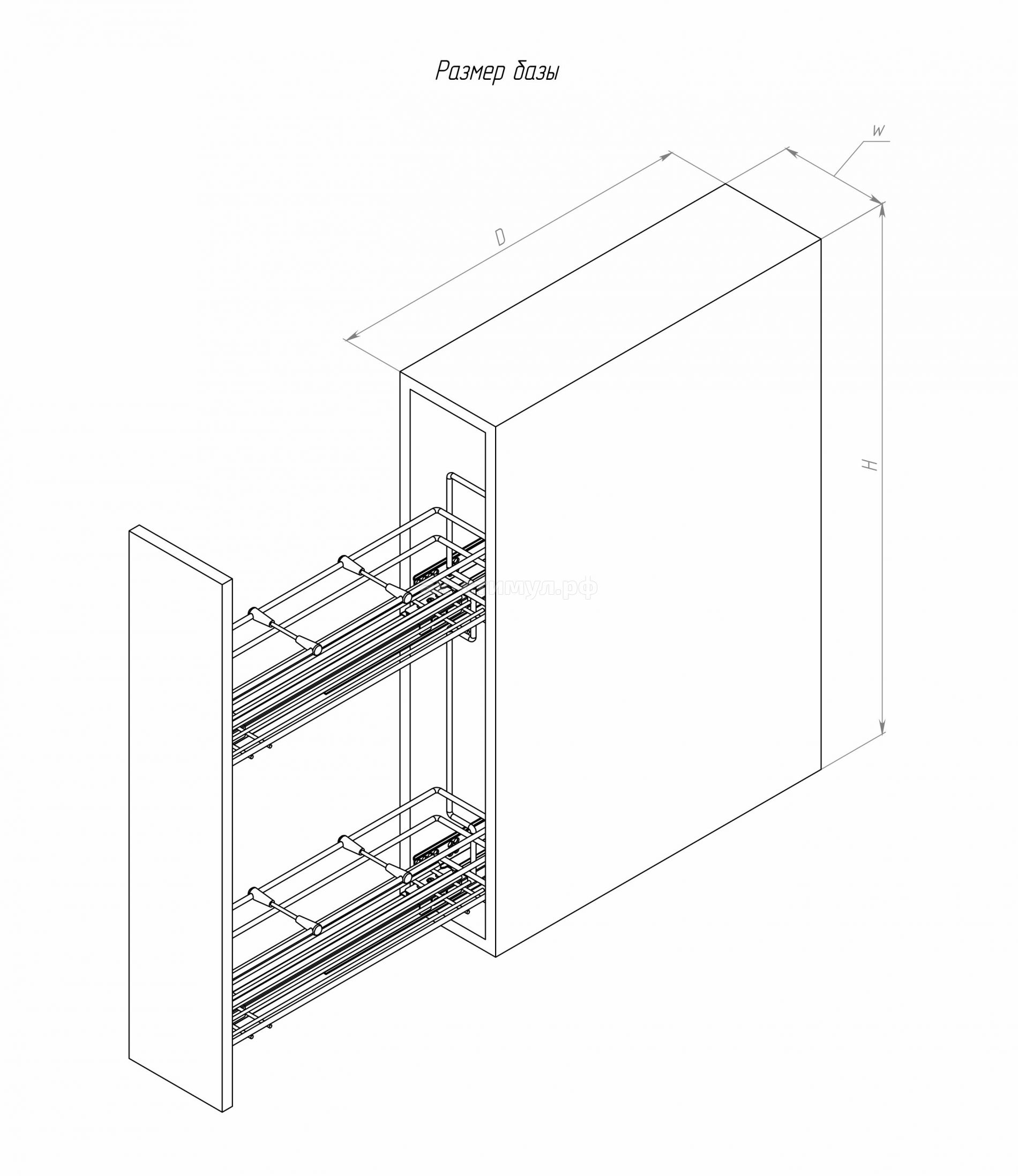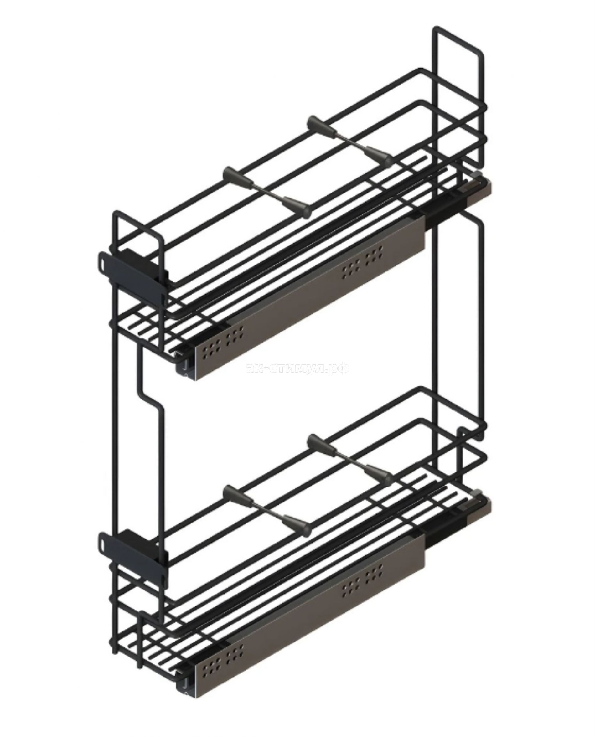 Бутылочница в модуль 150 мм, правая, 4 перегородки, направляющие GTV с доводчиком, черный - специализированный элемент кухонной мебели в виде двухуровневой выдвижной корзины, предназначенный для рационального хранения бутылок и ёмкостей с жидкостями (растительное масло, соусы, напитки и т. п.), а также банок со специями, крупами и другими продуктами.