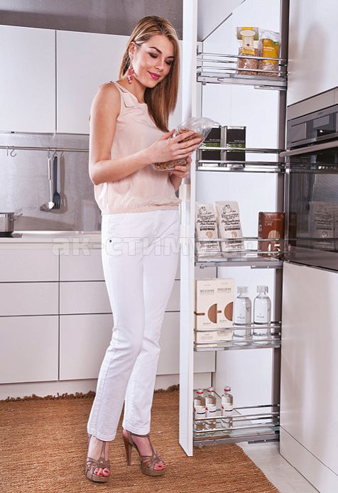 Выдвижная колонна для организации хранения ёмкостей на кухне.Эргономичная организация внутреннего пространства колонны позволяет хранить множество предметов разного размера и высоты.