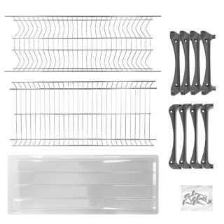 Сушка для посуды проволочная, двухуровневая, с двумя алюминиевыми профилями, а также с двумя пластиковыми поддонами, с пластиковыми держателями в количестве 4 штук. Цвет сетки - хром полированный, цвет держателей - серый, поддоны - бесцветные. Допустимая нагрузка каждого уровня 3 кг.