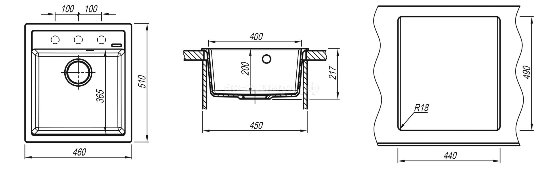 Мойка поставляется с полным комплектом арматуры, сифон с переливом, выпуск, крепеж, шаблон (трафарет) для удобного выреза на столешнице.