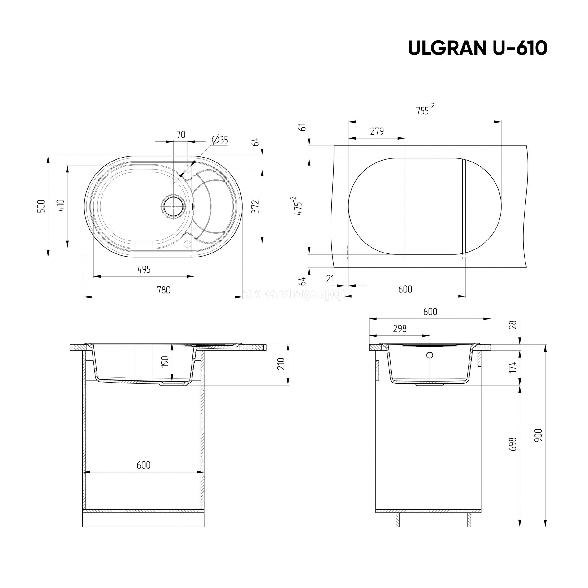 ULGRAN U-610 – односекционная реверсивная кухонная мойка с вместительной чашей. Данная мойка устанавливается в шкаф шириной от 60 см и является оборачиваемой. В комплектацию входят: сливная арматура с гофротрубой, технический паспорт и гарантийный талон. Заводская гарантия составляет 4 года, а срок службы данной мойки, при соблюдении основных правил ухода за ней, составляет более 10 лет.