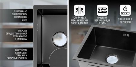 Кухонные мойки высокого качества, которое достигается за счет пищевой нержавеющей стали марки AISI304, разработанной по европейским стандартам качества, что позволяет быть продукту экологически чистым. Преимуществом данной кухонной мойки является толщ.металла чаши мойки 1мм. а верхняя часть 3мм. Мойки по всему корпусу имеет шумопоглащающую обливку, что позволяет ей быть практически бесшумной.