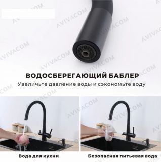 Смеситель черный с черным упругим изливом и краном для питьевой воды