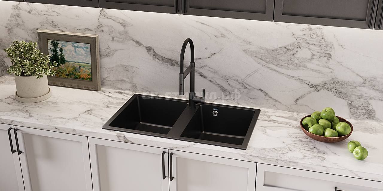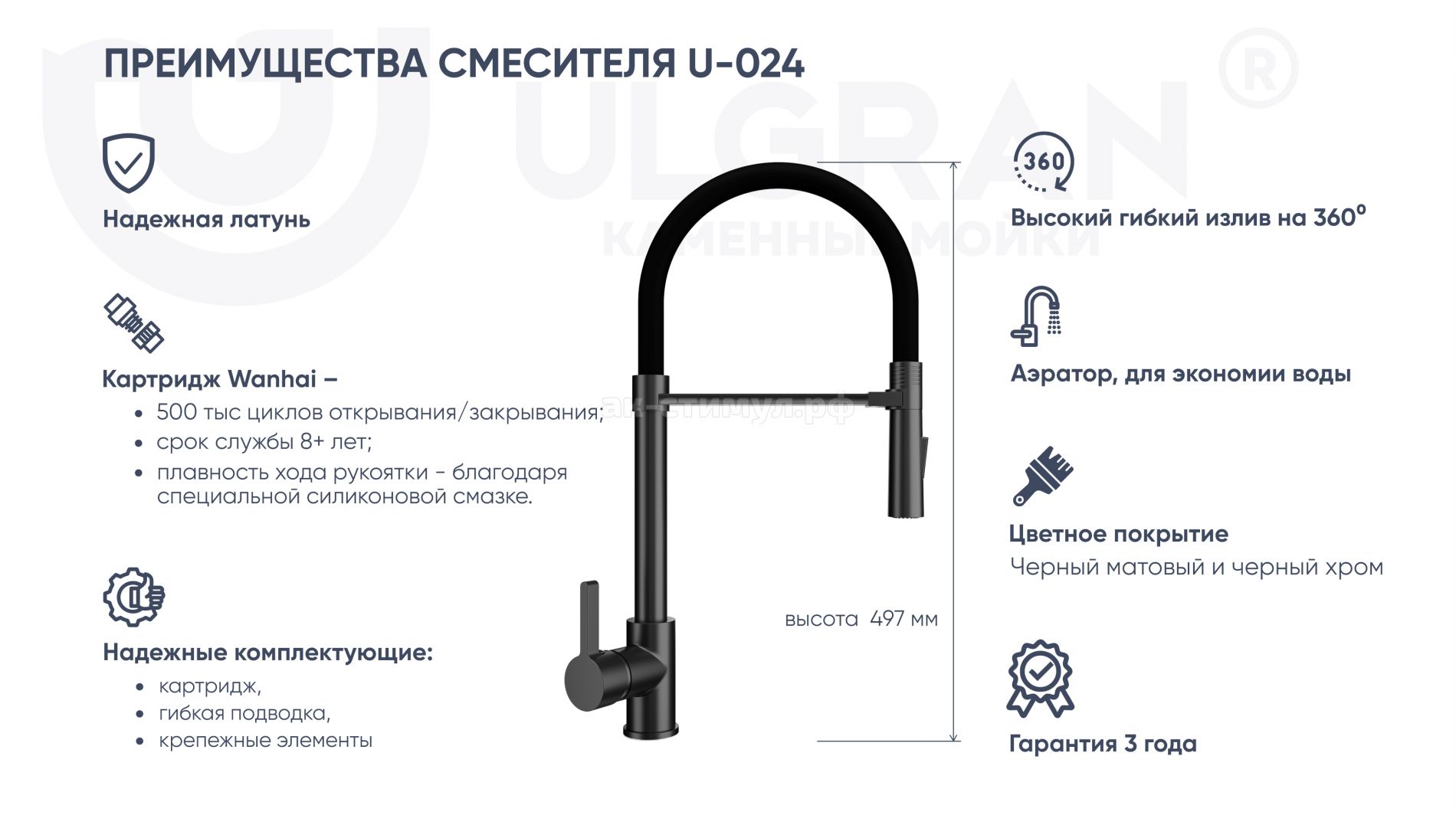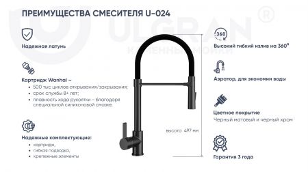 Смеситель ULGRAN U-024 – это стильный и современный кухонный смеситель с высоким гибким изливом черного цвета. Материал корпуса выполнен из высококачественной латуни, сверху корпус смесителя имеет специальное черное матовое покрытие.