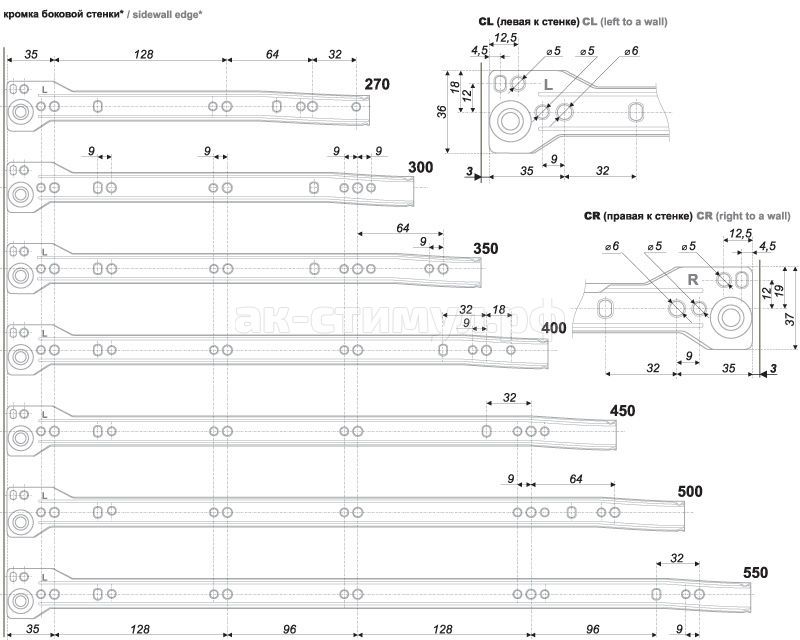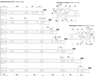 Направляющие МВ для изготовления выдвижных ящиков, с регулировкой фасада по высоте (+/-2 мм), неполного выдвижения, с самозатягиванием, двойным остановом и защитой от выкатывания. Для ящиков с высотой боковой стенки 86 мм.